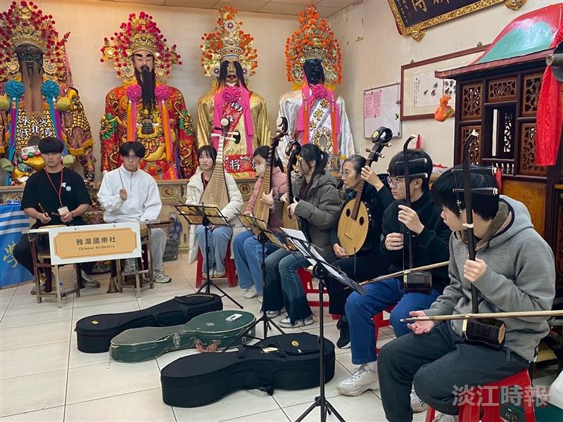 課程以國樂與北管旋律融合為特色,特別邀請淡水南北軒總幹事、本校通核中心助理教授翁瑋鴻,分享北管的發展歷程及文化背景;國樂社幹部則介紹國樂及樂器的歷史演變。此外,安排基礎視譜、樂曲教學、北管擊樂教學與結合北管文化的闖關活動,讓學員們實際演奏樂器,並將北管曲目與國樂旋律相互結合,加深對北管音樂的理解與體驗。最後,前往淡水南北軒進行成果發表,驗收3天的學習歷程。